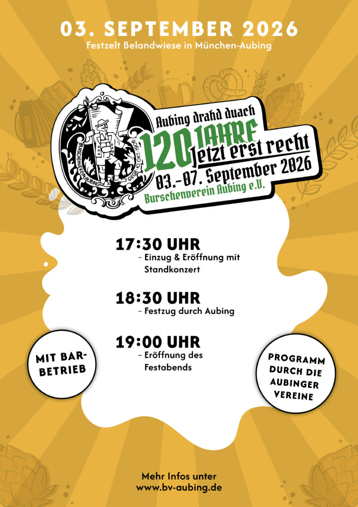 Der Burschenverein Aubing e.V. feiert dieses Jahr sein 120-jähriges Jubiläum – und das lassen wir uns natürlich nicht entgehen! Unser Festsonntag verspricht alles was das Herz begehrt – und vor allem eins: jede Menge Gaudi!
