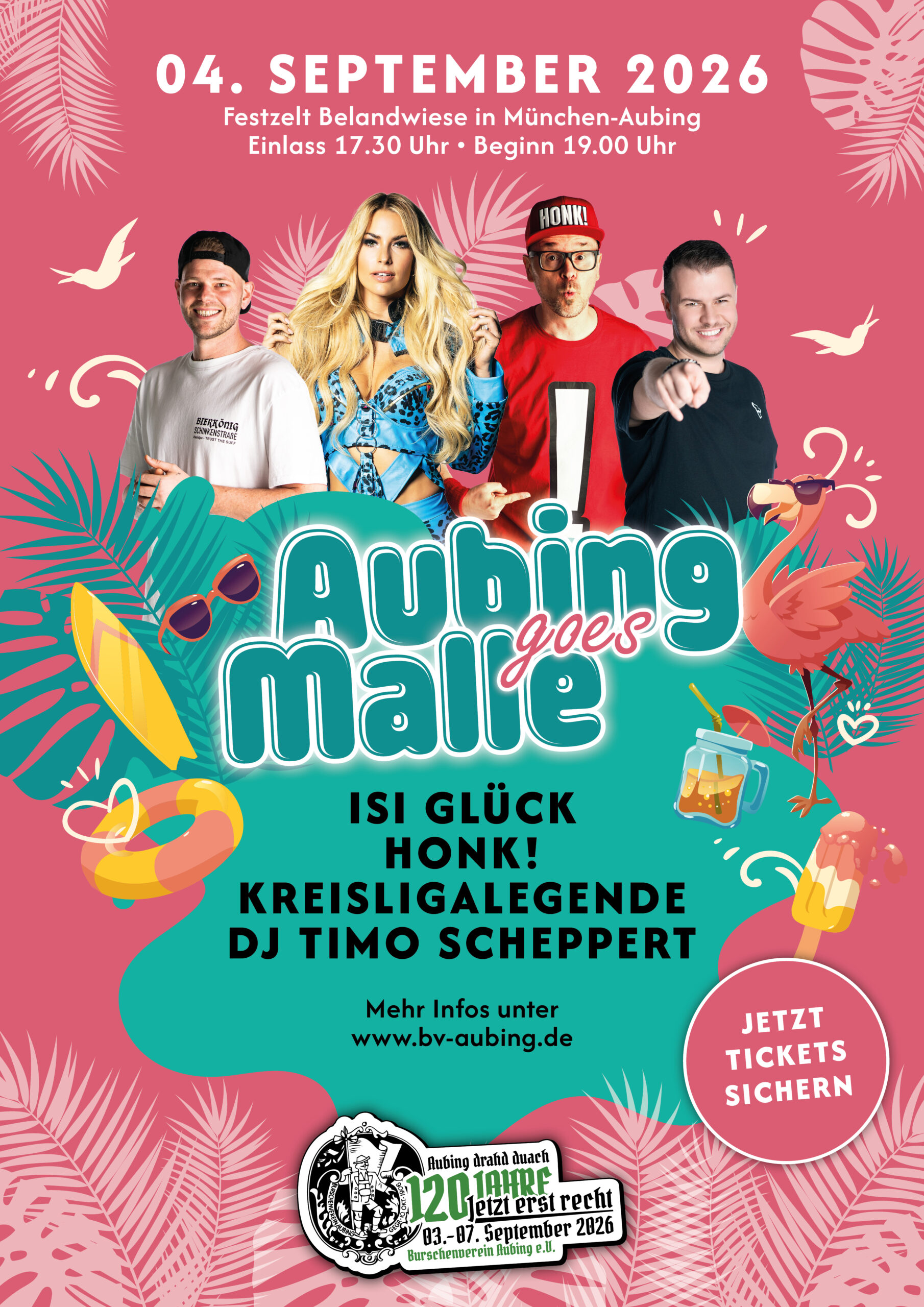 Dieses Jahr fliegen wir nicht nach Malle – wir holen Malle einfach direkt zu uns nach Aubing! Am 04. September 2026 verwandelt sich unser Festplatz in die Partyhochburg Nr. 1: Ballermann-Vibes, Bier ohne Ende und die besten Live-Acts von der Playa – mitten in München!