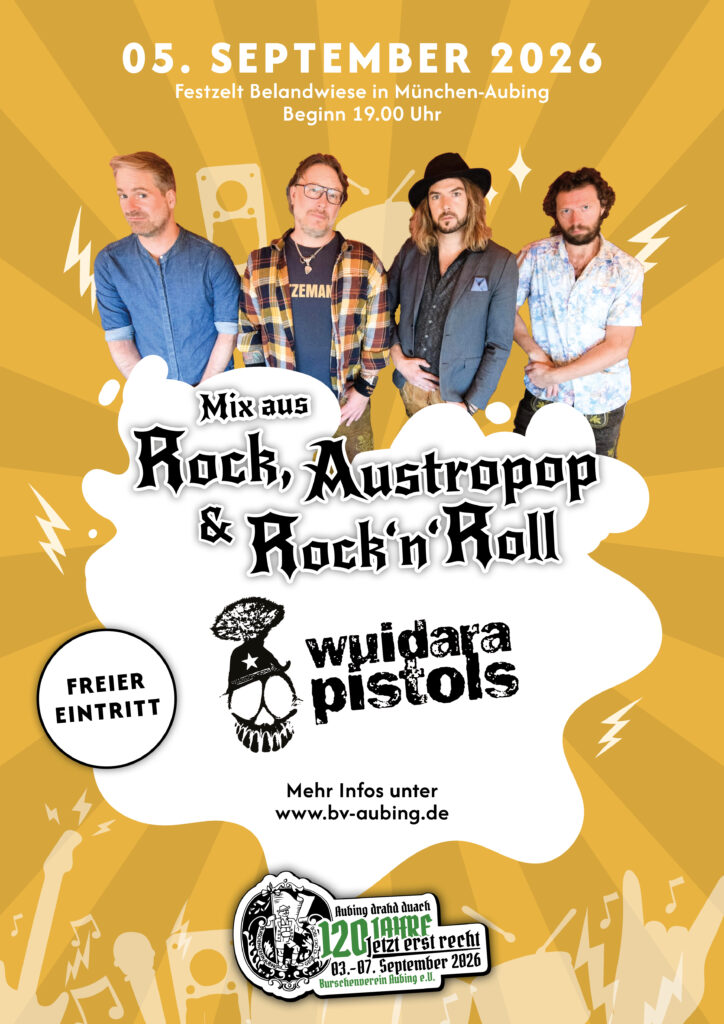 Wenn’s um echte Partystimmung geht, dann sind sie längst kein Geheimtipp mehr: Die Wuidara Pistols! Zum Jubiläum des Burschenverein Aubing heizen die Vollblut-Musiker das Festzelt so richtig ein und sorgen dafür, dass garantiert niemand lange auf der Bank sitzen bleibt. Mit ihrer unverwechselbaren Mischung aus rockigen Klassikern, bayerisch-fetzigem Sound und Songs zum Mitsingen treffen sie genau den Nerv des Publikums – von jung bis alt.